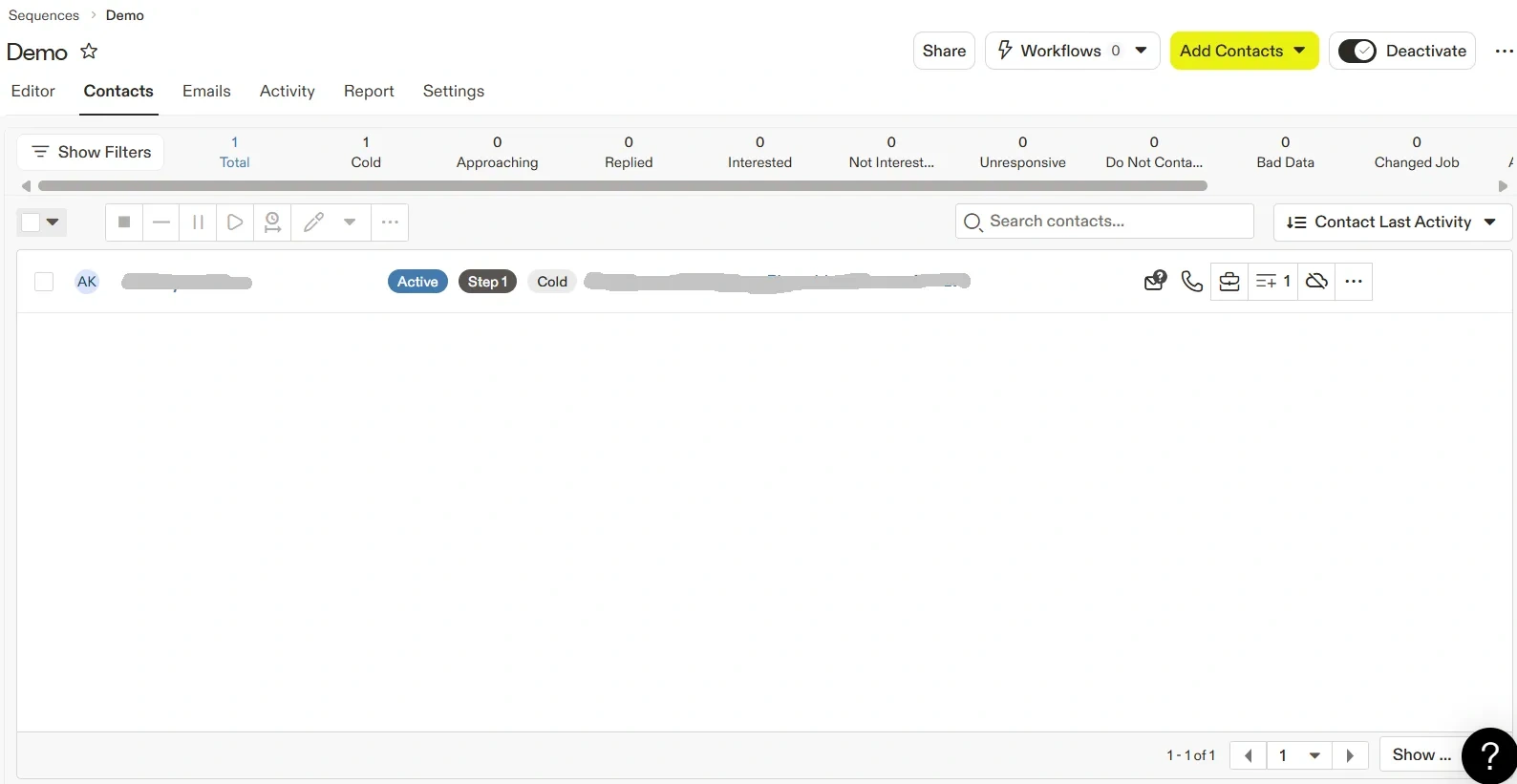 The Contacts tab displays all prospects added to the sequence and helps manage their participation.