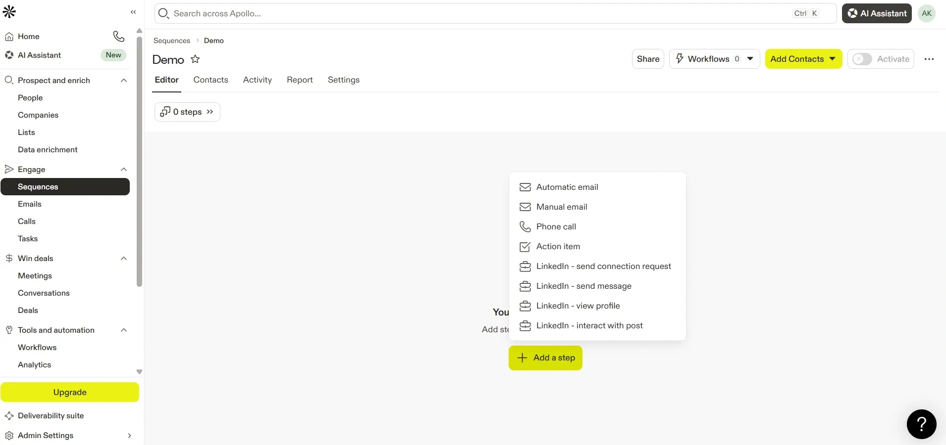 After creating a sequence, you will see the sequence builder, where you can add steps.