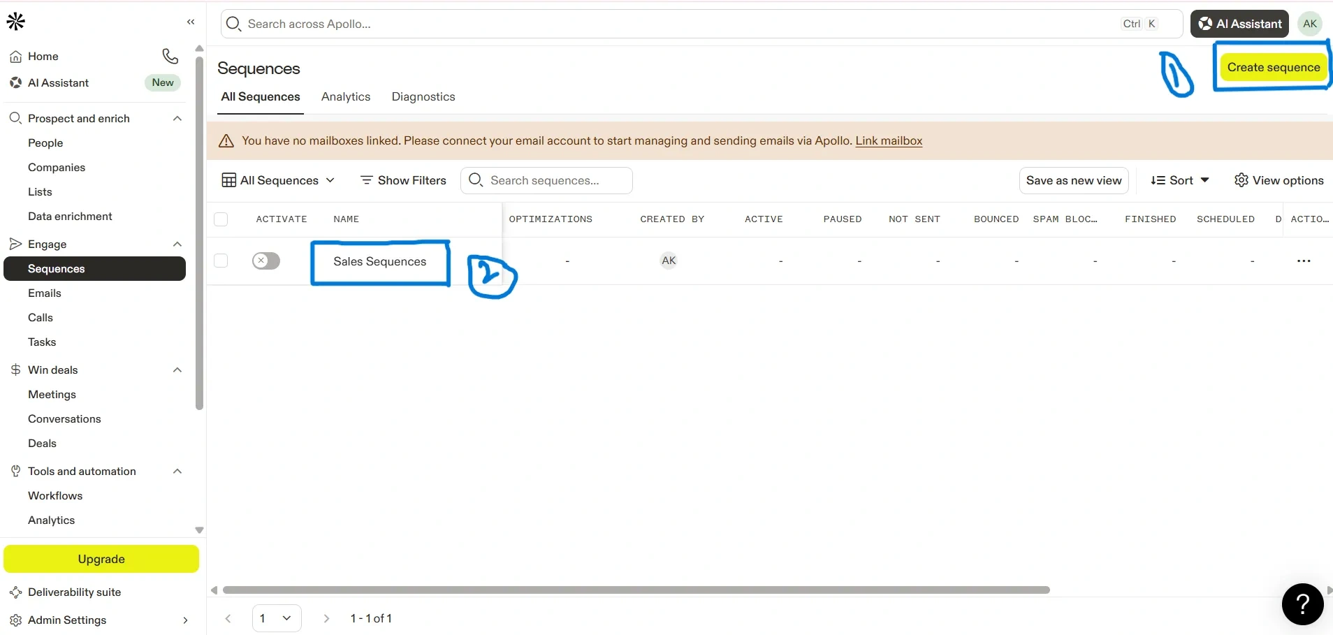 After click on Sequences, This will open the Sequences page, where you can , Create a new sequence, View existing sequences