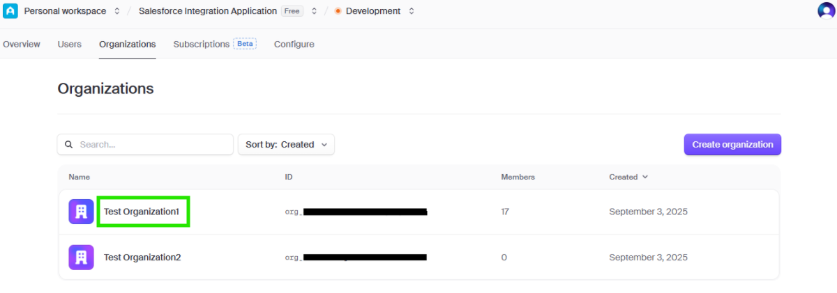 You able to see that the Test Organizatin is created successfully in the clerk: