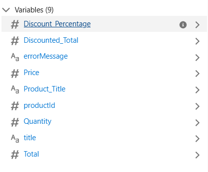 - Create these below variable:(Make sure Availability Outside the Flow should be Available for input for productId and title. And apart from these 2 fields we have to make Available for output for others variable)