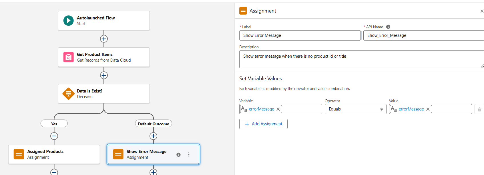 - Select Assignment element for Show Error Message and fill following details as mentioned in image.
