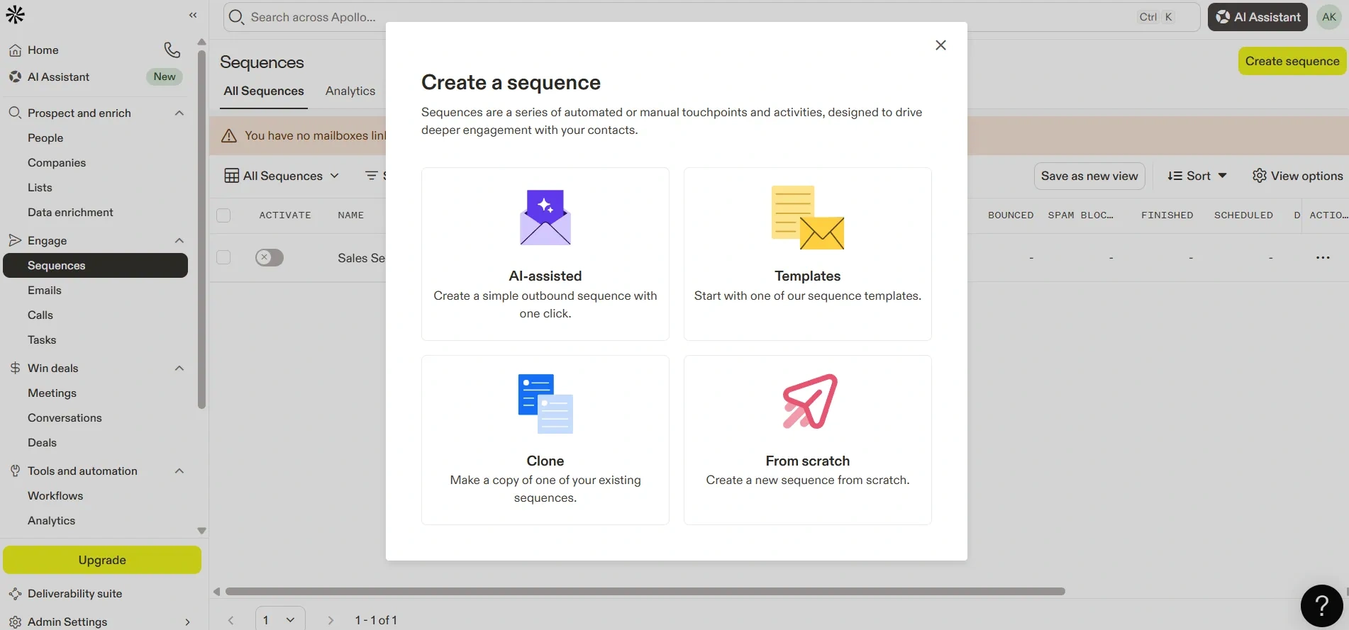 The Sequences tab in Apollo is a handy tool that helps you automate your outreach. Think of it as a way to set up a plan once, and then let Apollo do the work for you. Even if you’re just starting out, you can easily build a sequence by following a few simple steps. With clear planning and straight forward messages, sequences can save you time, keep you organized, and make it easier to connect with prospects. It’s a smart way to boost productivity and engagement without adding extra stress