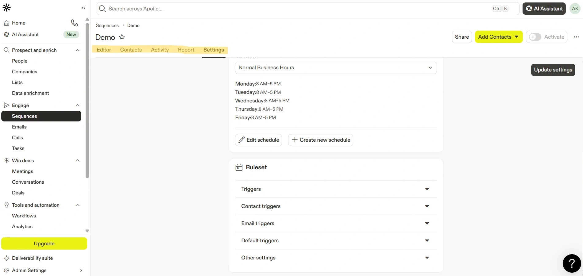 The Contacts tab displays all prospects added to the sequence and helps manage their participation.